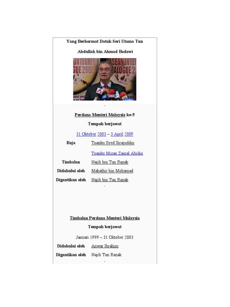 अब्दुल्लाह अहमद बदावी dato' seri abdullah bin haji ahmad badawi, yang amat berhormat tun abdullah hj. Born 26 november 1939) is a malaysian politician who served as the 5th prime minister of malaysia from 2003 to 2009. Born 26 november 1939) is a malaysian politician. He had a reputation as a clean administrator and a tough negotiator, but many wondered if he could emerge from the shadow of his commanding. Koleksi ucapan abdullah ahmad badawi 2005 by abdullah bin haji ahmad badawi( book ).