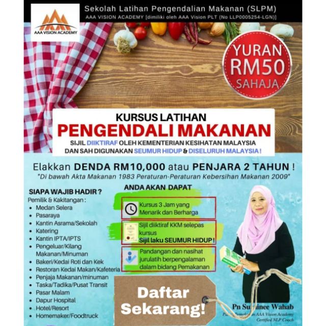Kini opsyen kursus onsite di lokasi anda / online virtual learning, kursus pengendalian makanan ini memberi tunjuk ajar asas panduan dan ilmu amalan pengendali makanan selamat.