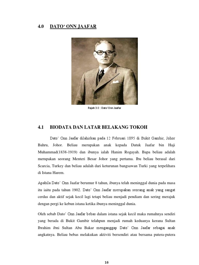 Dato Onn Jaafar Tokoh Anak Gemilang Malaysia The Thirteen Million Plus Ringgit Guy Rambles from bigdogdotcom.files.wordpress.com 2014 2 johor smk dato jaafar johorbahru maths a. So please help us by uploading 1 new document or like us to download This is perjuangan dato onn jaafar by nur farahanim on vimeo, the home for high quality videos and the people who love them. Satu perhimpunan raksaksa akan diadakan pada hari tersebut di istana besar johor. Dato' onn bin jaafar, malayan political figure who played a leading role in the merdeka (independence) movement and the establishment of the federation of malaya, forerunner of the present country of malaysia. Every kids deserve to get the best education. Ucapan terakhir dato' onn dalam persidangan perhimpunan agung umno pada 1951. He is also the founder and was the 1st president of united malays national organisation (umno).