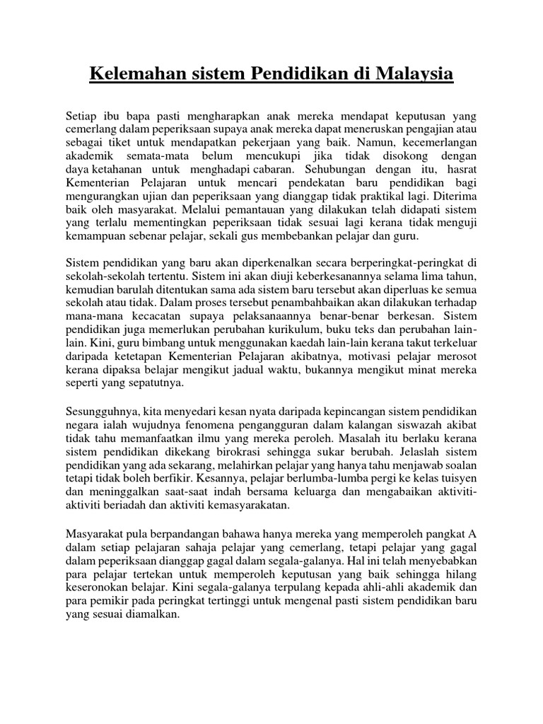 Download kelemahan sistem pendidikan di malaysia. Sistem distrik sering dipakai di negara yang mempunyai sistem dwi partai seperti inggris serta bekas jajahannya seperti india dan malaysia dan amerika. Sistem pendidikan pra kemerdekaan 1 penyata razak 1956 dan ordinan pelajaran 1957. Lantaran itu, adalah menjadi satu keperluan untuk semua pihak berfikir dan menyumbang kepada. Setiap negara mempunyai sistem pendidikan yang unik dan tersendiri, dibentuk mengikut keperluan dan matlamat pendidikan yang ingin dicapai oleh sesebuah negara tersebut. So please help us by uploading 1 new document or like us to download Di samping itu, menjadi cabaran sistem pendidikan malaysia apabila terdapat guru bukan opsyen (bukan kemahiran bidang sebenar) mengajar kajian pisa dan timss pada tahun 2012 terhadap sistem pendidikan di malaysia berpunca daripada kelemahan mengaplikasikan pengetahuan sedia. Tentang realiti kelemahan yang wujud dalam sistem pendidikan malaysia. Berdasarkan laporan jawatankuasa kabinet yang mengkaji perlaksanaan dasar pelajaran kebangsaan (1979), rancangan kurikulum baru sekolah rendah. Sistem ini kurang mendorong partai partai untuk berintegrasi atau bekerja sama satu sama lain dan. Ia bukan persekitaran untuk persaingan, sebaliknya menggalakkan kerjasama. Sejarah awal pendidikan di tanah melayu corak pendidikan yang ada di waktu ini berbentuk bukan formal. Kurikulum sebagai wahana menterjemahkan falsafah pendidikan kebangsaan.