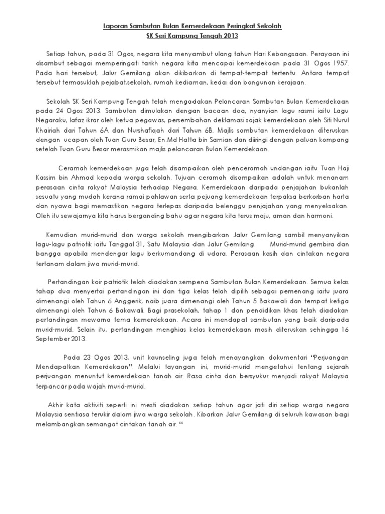 Laporan Sambutan Bulan Kemerdekaan 1 from imgv2-2-f.scribdassets.com 1.ust mazani abd rahman 019 4734011 2. Hari kemerdekaan negara yang kita sambut setiap tahun mempunyai kebaikan dan kepentingan yang tersendiri. Dan maklumkan kepada pihak sekolah. Dicatat oleh erda di 11:28 pm. Kebaikan sambutan hari kemerdekaan di sekolah. Pada bulan ini pelbagai aktiviti diadakan bagi menarik perhatian para pelajar untuk menumpukan perhatian kepada aspek sifat patriotisme and memahami erti kemerdekaan. Sekolah kebangsaan bukit rokan (lktp) moe 2 months ago. Tanggal 31 ogos setiap tahun , sambutan bulan kemerdekaan akan diadakan sama ada di peringkat kebangsaan, peringkat negeri mahupun di peringkat sekolah.